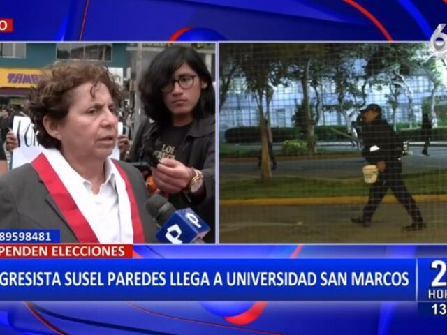 La congresista del Bloque Democrático, Susel Paredes, llegó hasta las instalaciones de la Universidad Nacional Mayor de San Marcos (UNMSM), luego que anoche un grupo de alumnos tomó la Decana de América, como medida de protesta ante presuntas irregularidades en las elecciones para elegir al nuevo rector.