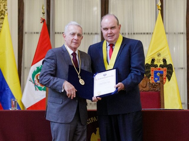 El exmandatario colombiano recibió la medalla de la ciudad de Lima y fue declarado Huésped Distinguido de la capital peruana, “en reconocimiento a su destacada trayectoria política y valiosa contribución en materia de educación, salud e inversión”.