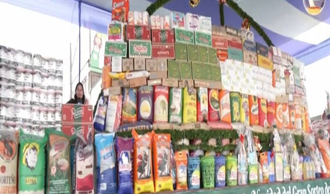 “Es la canasta más grande del mundo. Contiene arroz, azúcar, fideos, aceite, chocolate, menestras, conservas de durazno, conservas de pescado, papel higiénico, papel toalla, vino, gaseosa, sal, entre otros productos”, explicó.