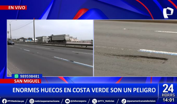 Diversos conductores reportaron la presencia de enormes huecos en un tramo de la Costa Verde, en el distrito de San Miguel, representando un peligro para los vehículos que diariamente circulan por dicha vía.