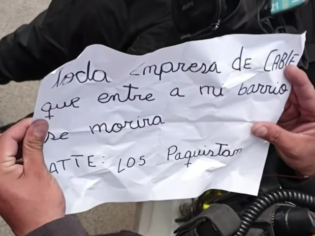 En un alarmante ataque ocurrido en la calle Pedro Ruiz, en la zona de Año Nuevo del distrito de Comas, sujetos dispararon contra un vehículo de una empresa subcontratada por una operadora de telefonía. Los atacantes dejaron una nota extorsiva advirtiendo que ninguna empresa de cable podía ingresar al barrio bajo amenaza de muerte. "Toda empresa de cable que entra a mi barrio se morirá: Atentamente Los Pakistán", rezaba el mensaje firmado por la supuesta banda delincuencial.