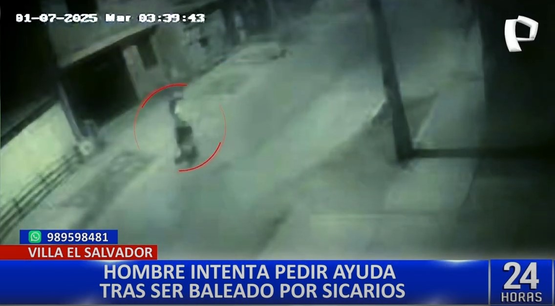 Continúan las muertes a manos del sicariato. Un hombre fue captado por las cámaras de seguridad del municipio de Villa El Salvador (VES) pidiendo ayuda tras ser baleado por sicarios.