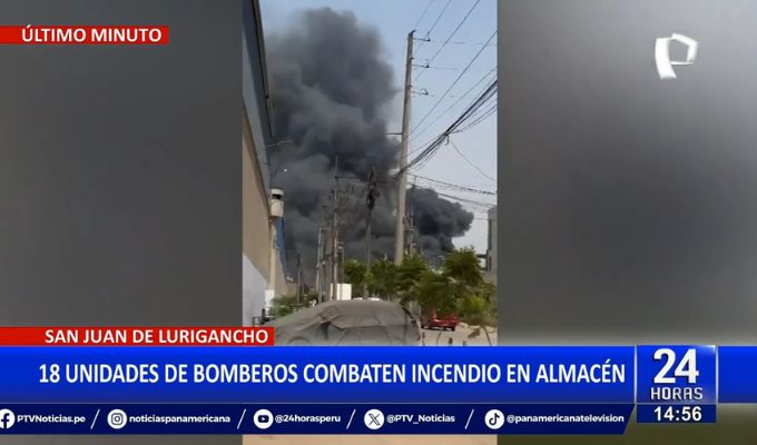 Un incendio se ha registrado en un almacén del distrito de San Juan de Lurigancho en horas de la tarde de este martes 21 de enero. Aproximadamente 18 unidades de Bomberos se encuentran atendiendo la emergencia.
