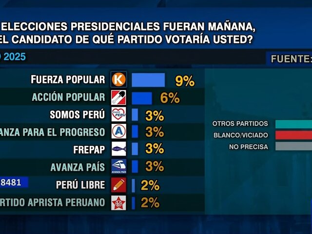 Según la última encuesta de Ipsos, si las elecciones fueran mañana, Fuerza Popular lideraría con un 9% de intención de voto, seguido por Acción Popular con un 6% y Somos Perú con un 3%. En el mismo nivel se encuentran Alianza para el Progreso, el Frepap y Avanza País, todos con 3%, mientras que Perú Libre y el Partido Aprista obtienen un 2% cada uno.