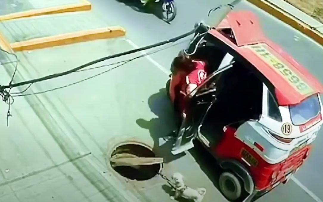 Una mujer, que descendía de una mototaxi acompañada de su mascota, sufrió una aparatosa caída al no percatarse de que la tapa del pozo se encontraba en mal estado.