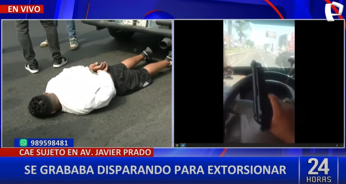 Agentes de la Policía Nacional lograron la captura de un peligroso extorsionador que se grababa realizando disparos para amedrentar a sus víctimas. La intervención se realizó en las inmediaciones de la Biblioteca Nacional, en la avenida Javier Prado, distrito de San Borja.