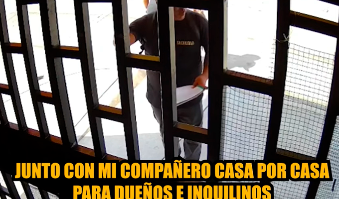 De acuerdo con los testimonios, los individuos cargan una tabla con hojas que simulan una lista de aportantes y se presentan insistentemente en los domicilios. Uno de ellos incluso viste como si fuera personal de seguridad, lo que refuerza la idea de una supuesta formalidad. Sin embargo, desde las cámaras de vigilancia se evidenció que los sujetos usan este método reiteradamente en distintos sectores del distrito.