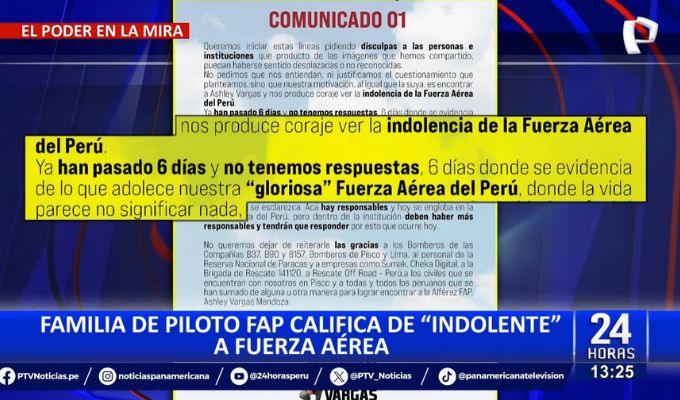 En su pronunciamiento los familiares arremetieron contra la Fuerza Aérea del Perú (FAP) calificándola de "indolente" al no contar con ningún canal de comunicación para informar sobre los avances en la búsqueda de la piloto.