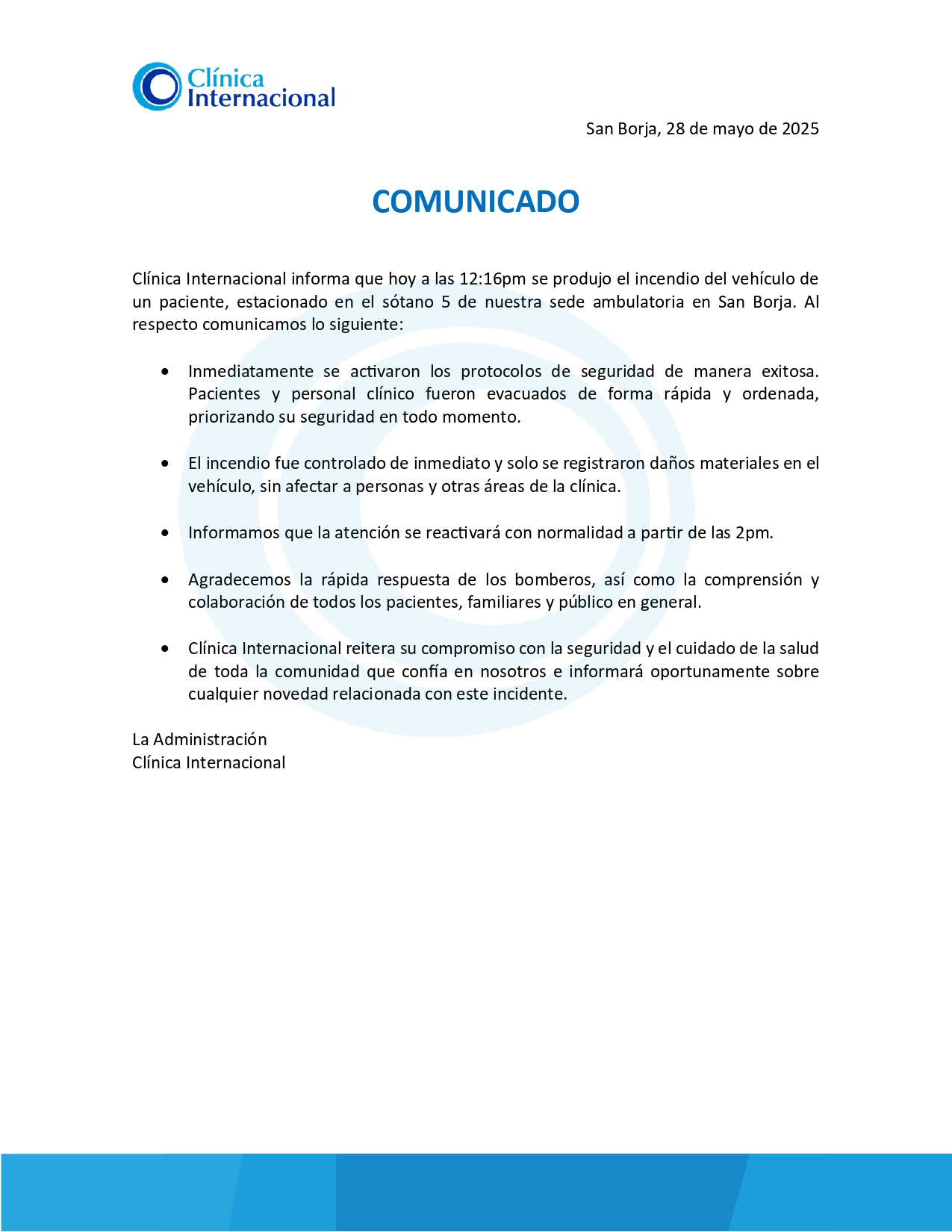 Un incendio se registró este miércoles 28 de mayo, en la cochera de la Clínica Internacional, en la avenida Guardia Civil, en San Borja. Debido al siniestro se produjo la evacuación total de pacientes y personal médico.