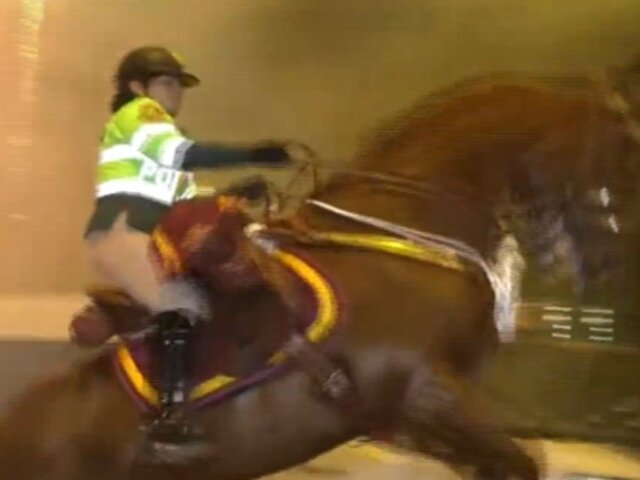 Agente de la Policía Montada es arrojada por su caballo tras explosión de fuegos artificiales