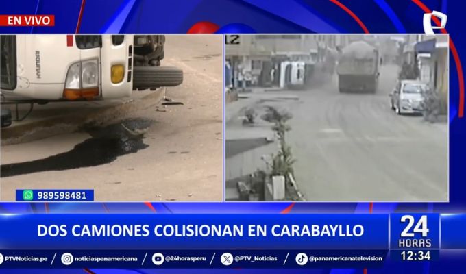 Las cámaras de seguridad registraron el incidente ocurrido a la altura del kilómetro 22.5 de la avenida Túpac Amaru. El camión de color blanco terminó tendido a un costado de la vereda tras el impacto con la otra unidad.