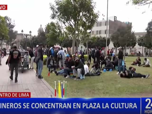 En medio de las protestas que se vienen registrando en Lima por parte de mineros desde hace más de siete días, los manifestantes del gremio se vienen concentrando en grupos en Plaza La Cultura, ubicado al frente del Parque Universitario.