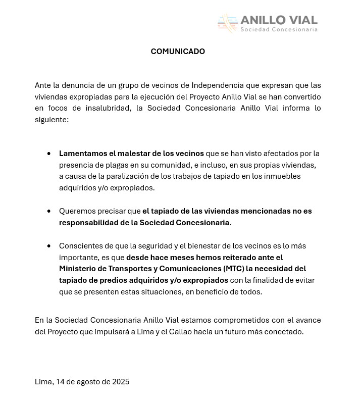 Desde la Municipalidad de Independencia, el jefe de Asesoría Jurídica, John Giraldo, señaló que el municipio ha cumplido con la limpieza de exteriores y retiro de escombros, pero precisó que el tapiado de los inmuebles corresponde al Ministerio de Transportes y Comunicaciones (MTC). “Estamos a la espera de que cumplan con la parte que les corresponde”, indicó.