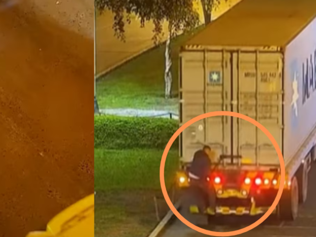 En las imágenes de las cámaras de seguridad se observa cómo uno de los sujetos se trepa a la parte trasera del camión en movimiento para sustraer la mercadería, mientras un auto blanco le brinda cobertura. Detrás, otros dos vehículos bloqueaban el tránsito e impedían la intervención de conductores que presenciaban la escena. Lo robado era arrojado a la pista y recogido por los cómplices en segundos.