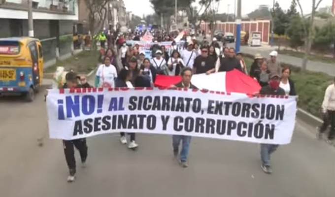La protesta comenzó en el mercado José María Argueda, desde donde los manifestantes, portando pancartas, se dirigieron hacia la municipalidad del distrito, reclamando acciones concretas contra la criminalidad.