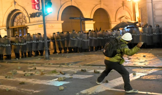 06:35 p.m. Los protestantes continúan su desplazamiento hacia la avenida Abancay pese al cordón policial desplegado en la zona.