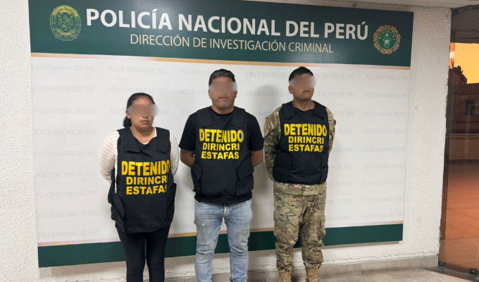 Se trata de los presuntos integrantes de la banda criminal 'Los Falsos de los Repuestos Aeronáuticos', identificados como Stephanie Francesca Ramos Boero (38), José Antonio Valladares Benavides (48) y Federico Espinoza Ordinola (36), este último vestía uniforme de la FAP.