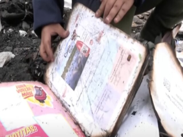 Como ella, decenas de niños y niñas de Pamplona Alta han perdido todo su material educativo. Entre los restos se observan mochilas, libros Coquito, cuadernos de matemáticas y comunicación completamente quemados.