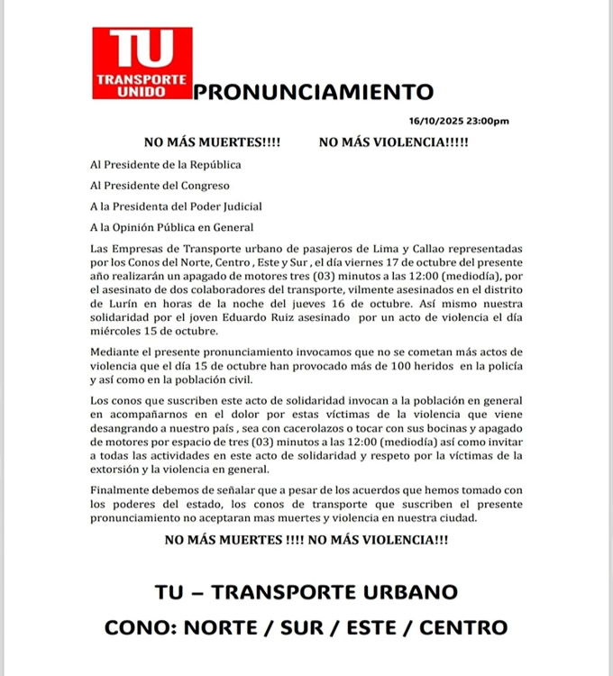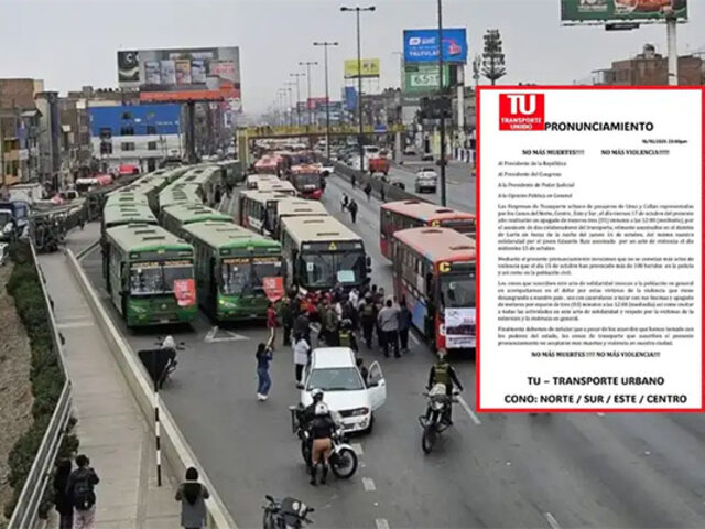 Representantes de las empresas de transporte urbano de Lima y Callao, anunciaron que este viernes, 17 de octubre, realizarán un apagado de motores simbólico de tres minutos a las 12:00 p.m.