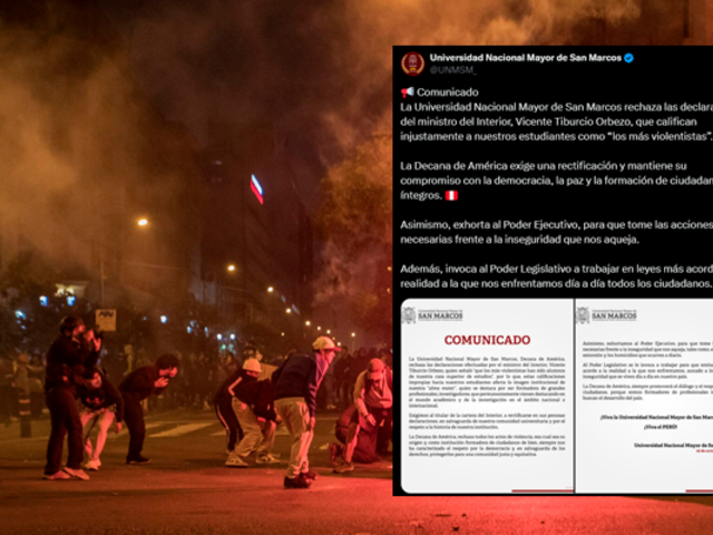 La Universidad Nacional Mayor de San Marcos (UNMSM) emitió un comunicado rechazando categóricamente las afirmaciones del ministro, al considerar que estigmatizan a su comunidad universitaria y dañan la imagen institucional. La casa de estudios sostuvo que no existen evidencias que sustenten dicha acusación y exigió al Ministerio del Interior mayor responsabilidad antes de señalar a colectivos estudiantiles.