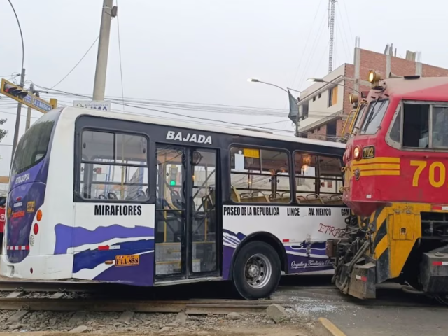 Un grave accidente se registró en la mañana de este martes en la intersección de las avenidas Ferrocarril y José Carlos Mariátegui, en el distrito de El Agustino, donde un tren impactó contra un bus de transporte público que había invadido las vías férreas. Producto del choque, otros dos vehículos —un Tico gris y una camioneta negra— también resultaron afectados, dejando un saldo de diez personas heridas.