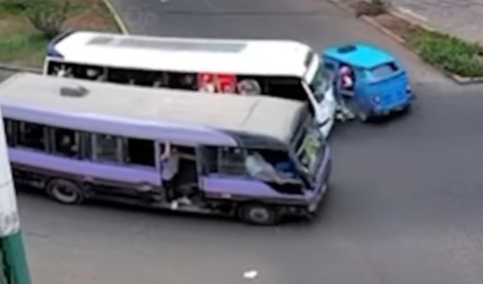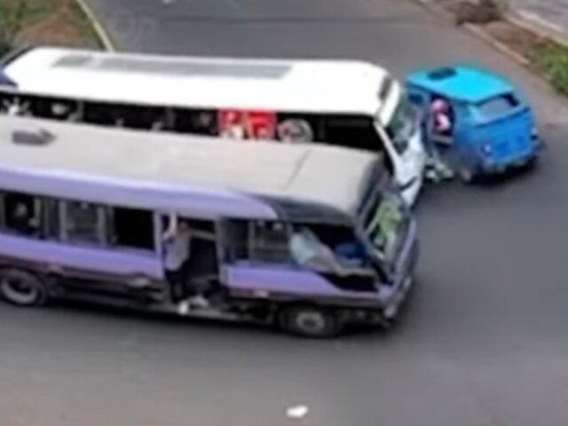 Cámaras de seguridad registraron el momento en que la mototaxi se desplazaba por la avenida con dirección de oeste a este, cuando una de las dos cúster que se habían pasado la luz roja del semáforo la embistió con fuerza, provocando que los ocupantes fueran expulsados del vehículo.