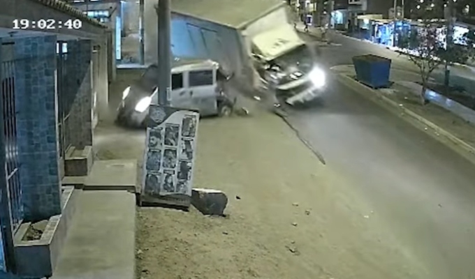 El choque se produjo a la altura del mercado Santa Rosa, en el anexo 8. Cámaras de seguridad de la zona captaron el momento exacto en el que el camión pierde el control y se estrella violentamente contra la unidad menor, además de colisionar con un poste y otros vehículos.