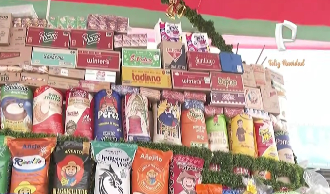 Un equipo de 24 Horas Mediodía llegó hasta el centro de abastos y pudo comprobar el gran tamaño de la canasta, la cual tiene un peso superior a las siete toneladas, donde se pueden observar sacos de arroz, azúcar, cajas de aceite, insumos de limpiezas, entre más productos.