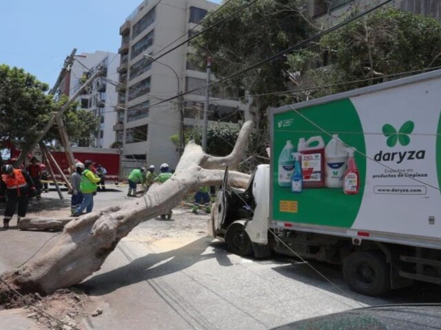 Momentos de pánico se vivieron en la cuadra seis de la calle Colón, en el distrito de Miraflores, cuando un árbol de aproximadamente 12 metros de altura cayó repentinamente sobre un camión que transitaba con normalidad por la zona. El fuerte estruendo alarmó a los vecinos, quienes salieron de sus viviendas y se encontraron con el vehículo aplastado por el pesado tronco.