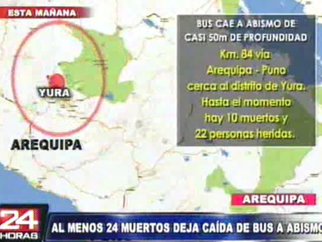 Esta mañana, un bus perteneciente a la empresa Andares cayó a un abismo de 50 metros a 84 kilómetros de la carretera Arequipa-Puno. El accidente habría provocado la muerte de al menos 24 personas.