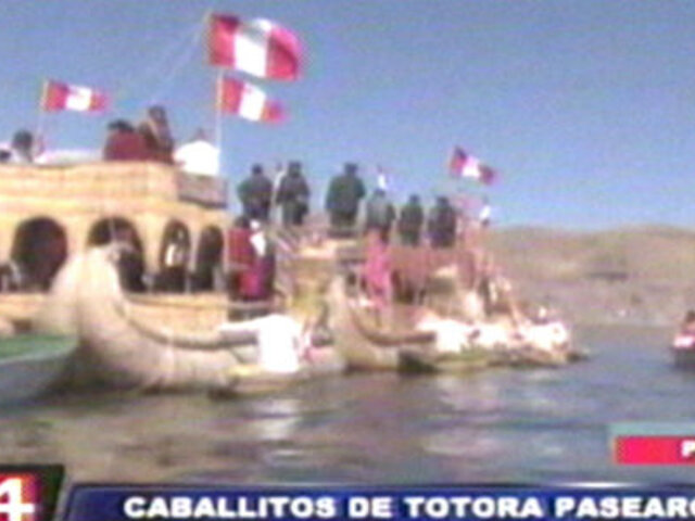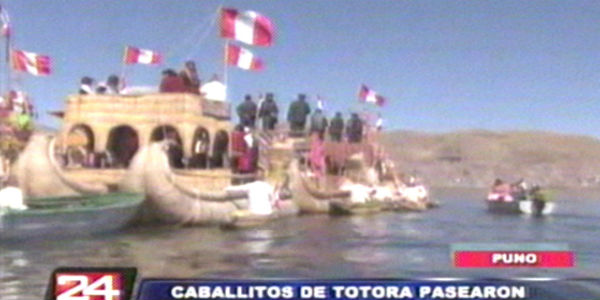 Caballitos de totora pasearon bandera peruana por el Lago Titicaca