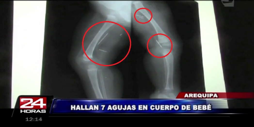Los médicos del hospital Honorio Delgado de Arequipa encontraron siete agujas de coser en las piernas y pecho de una bebé de siete meses. La pequeña de iniciales Y.Z. tenía los objetos de metal alojados en el tórax cerca del pulmón derecho y las otras en los miembros inferiores. El Ministerio Público y la Policía Nacional iniciaron investigaciones para esclarecer si se trata de un caso de maltrato infantil.