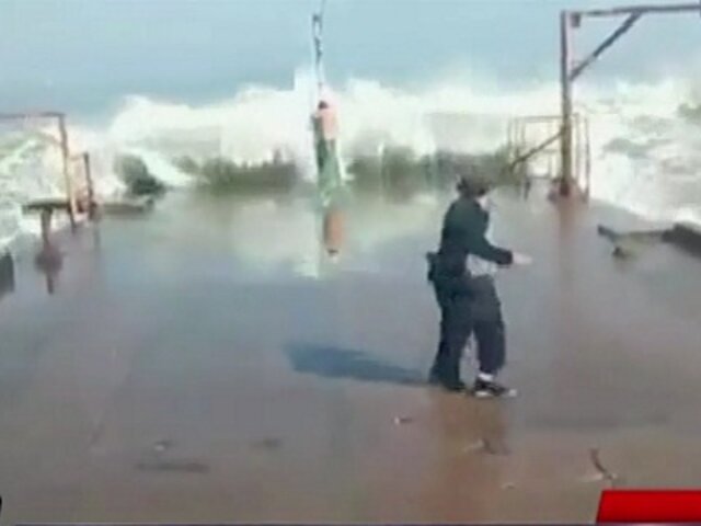 En Chincha, algunos pescadores arriesgaron sus vidas debido al fuerte oleaje que se viene registrando en las últimas horas. Las imágenes muestran como un hombre se aferra a un poste y soporta el impacto de una potente ola, mientras que otro logra alejarse del muelle de Tambo de Mora ante el fuerte maretazo.