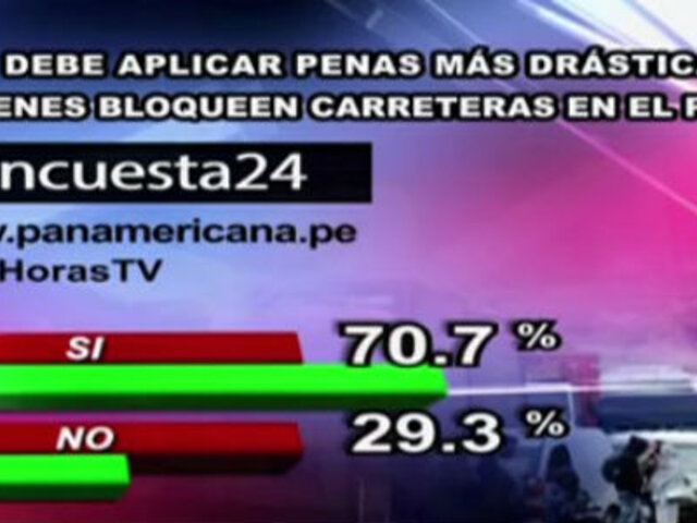 A la pregunta de este miércoles en Encuesta 24: “¿Se debe aplicar penas más drásticas a quienes bloqueen carreteras en el país?rdquo;, un elocuente 70.7% votó ‘Sí’. Un menor 29.3% optó por el ‘No’.