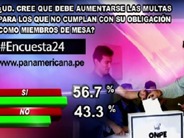 Los resultados de Encuesta 24 a la pregunta de este viernes revelaron que el 56.7% de peruanos considera que debe aumentarse las multas para los que no cumplan con su obligación como miembros de mesa. Sin embargo, un minoritario 43.3% considera lo contrario.
