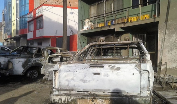 El fuego se originó luego que los miembros de la policía detonaran artefactos pirotécnicos en los exteriores de la sede. Al menos 10 vehículos incautados que se encontraban en proceso de investigación quedaron inservibles producto del incendio, que también afectó una vivienda aledaña y a un centro escolar.