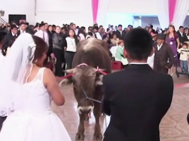 Gran cantidad de cajas de cerveza, dinero en efectivo, electrodomésticos, muebles, y hasta toros, a ritmo de huaylash, los invitados entregan los imponentes obsequios a los recién casados.
