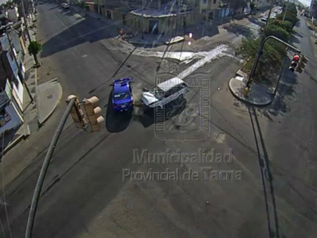 Cámaras de seguridad de la Municipalidad Provincial de Tacna, registraron un violento choque entre dos vehículos. El impacto dejó como saldo cuatro personas heridas.