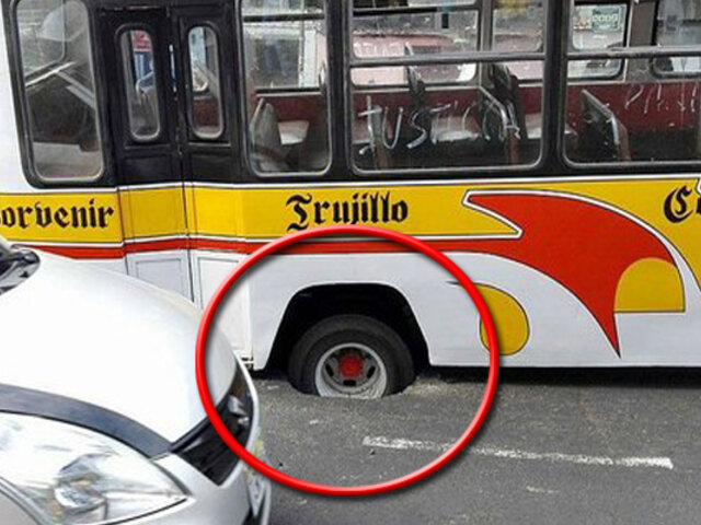 Momentos de tensión vivieron los pasajeros que se encontraban en un microbús, cuando la unidad de transporte de la empresa “El Cortijo” se hundió en plena avenida España, en Trujillo, a pocos metros del colegio Víctor Andrés Belaunde. Afortunadamente ningún pasajero resultó herido.