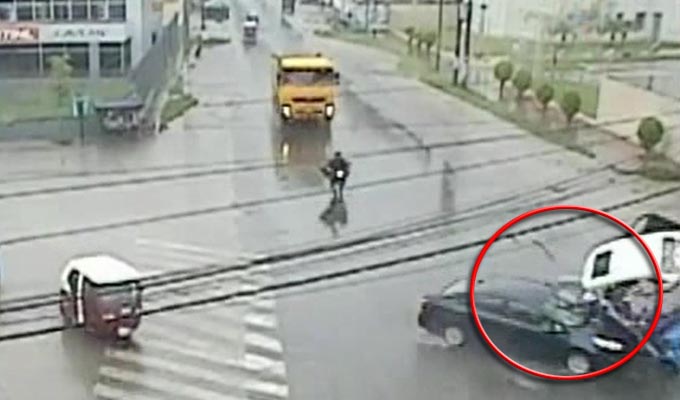 Una cámara capta el violento choque entre ambos vehículos, el conductor y las pasajeras de la mototaxi resultaron heridos tras el impacto.