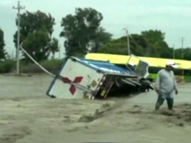Un camión y un bus interprovincial se volcaron al intentar avanzar por la Carretera Panamericana Norte, en la provincia de Ascope, debido al desborde del río Chicama.