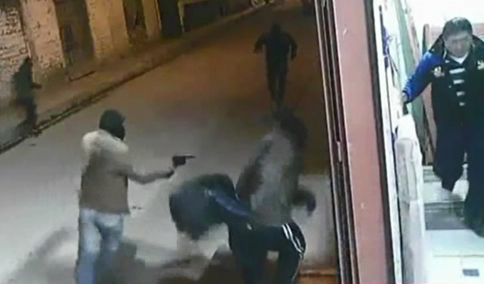 El hecho quedó registrado por las cámaras de seguridad, donde se observa a dos sujetos que aparecen cubriéndose el rostro con pasamontañas y tras ellos un niño que mira asombrado la escena al interior del establecimiento. Pasan unos segundos y aparecen dos delincuentes más, es entonces que el pequeño sale corriendo e instantes después se desata una balacera.