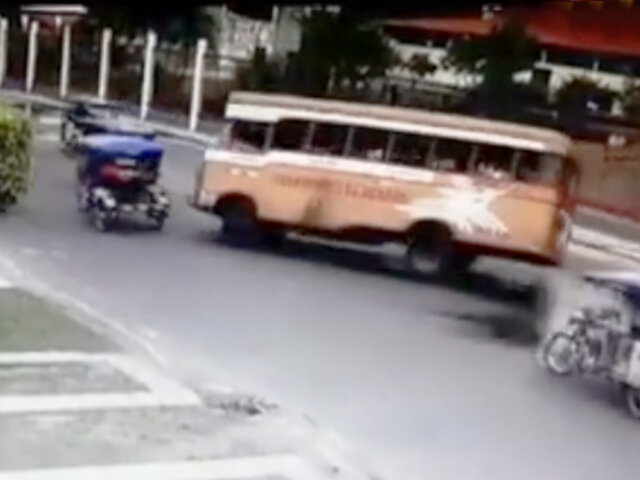 Una cámara de seguridad captó el momento cuando un bus de servicio público se estrelló contra una pared, en una calle de la ciudad de Iquitos. El chofer de dicha unidad, identificado como Roger Rengifo Duran de 56 años, realizó la arriesgada maniobra a fin de evitar una desgracia mayor.