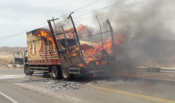 En Talara un camión de carga pesada se incendio a la altura del kilómetro 126 de la carretera Panamericana Norte, a pocos metros de llegar a la entrada de la Caleta El Ñuro. El vehículo de propiedad de la empresa de Transporte Expreso Marvisur E.I.R.L.