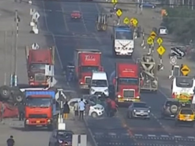 En Trujillo, un tráiler se despistó e impacto contra un taxi dejando dos personas heridas. La cámara de vigilancia de la Municipalidad de Moche captó el preciso momento en el que el pesado vehículo se descarrila y metros más adelante choca con un auto blanco.