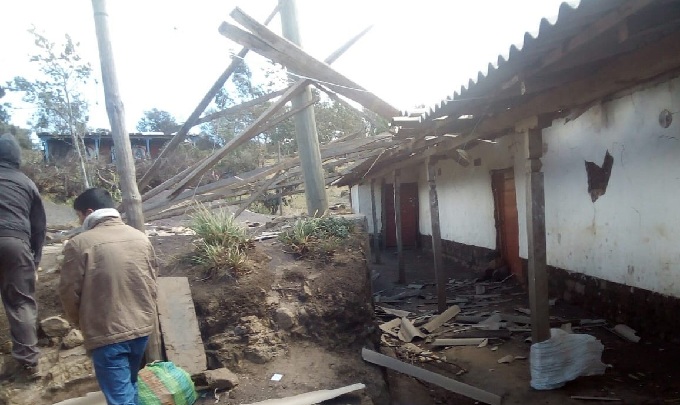Como se observa en las imágenes registradas por un poblador de la provincia de Huancabamba, las fuertes ráfagas destruyeron los techos de calaminas que terminaron volando por los aires.