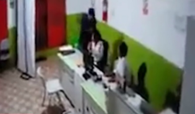 La víctima cae al piso y luego es levantado por el ladrón, quien lo lleva hasta la caja del local para apoderarse de todo el dinero en efectivo, mientras tanto su cómplice agrede a las dos trabajadoras que se encontraban en el módulo de atención.