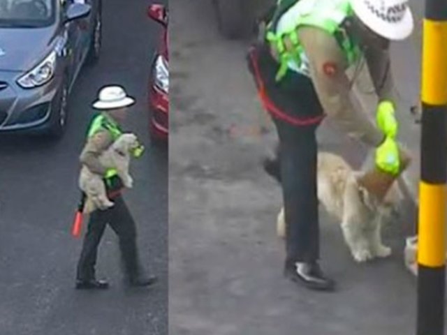 Una cámara de videovigilancia captó el momento en que un policía de tránsito alimentó a dos perros callejeros, luego de ayudarlos a cruzar la pista en la ciudad de Tacna.