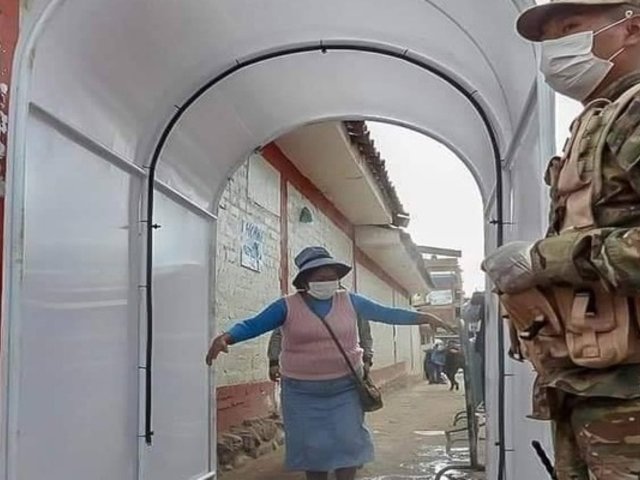 “Llega acá (el público) a la cámara, se da una vuelta y está desinfectado. Cuando sale de la misma forma. De esta forma tratamos de contrarestar esta pandemia”, expresó Albert Arenas, alcalde de esta comuna distrital.