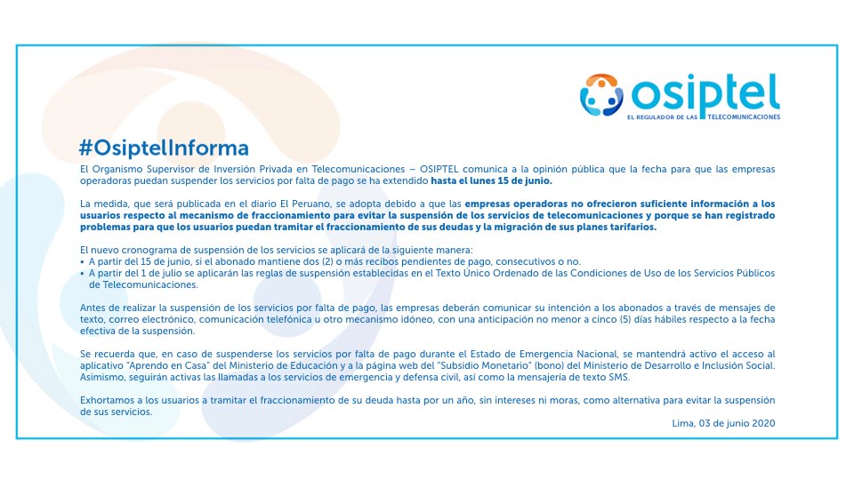 Osiptel: cortes de servicios por falta de pago se suspenden hasta el lunes 15 de junio